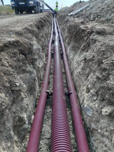 Ejecución de más de 1.500m de canalización formada por 3 tubos PE de 200mm y 2 tubos de PE de 110mm embebidos en prisma de hormigón. A lo largo de la canalización se ejecuta el cruce de 4 barrancos quedando la canalización protegida con piedra escollera.