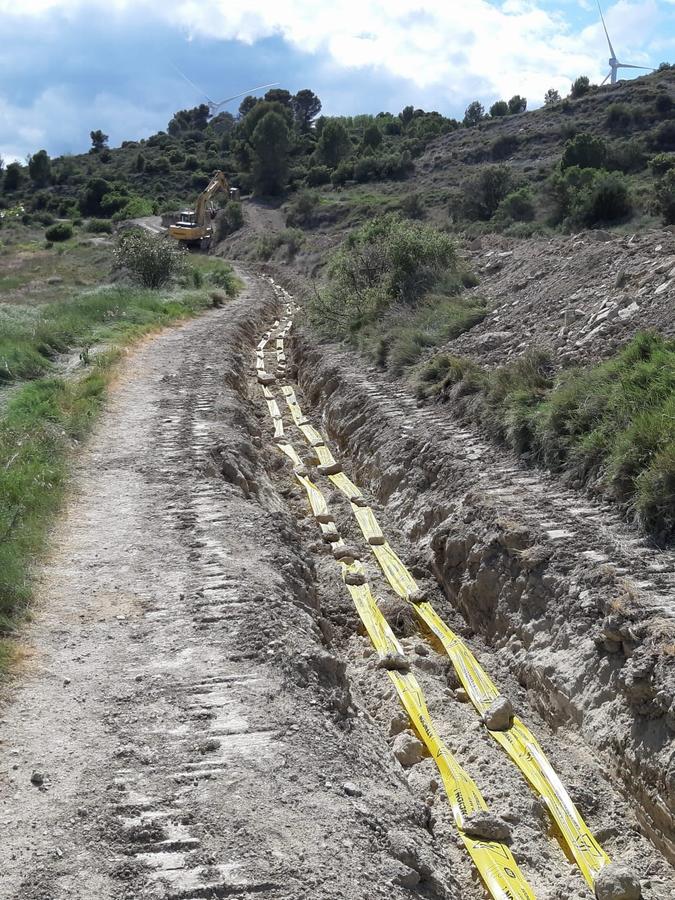 Ejecución de más de 1.500m de canalización formada por 3 tubos PE de 200mm y 2 tubos de PE de 110mm embebidos en prisma de hormigón. A lo largo de la canalización se ejecuta el cruce de 4 barrancos quedando la canalización protegida con piedra escollera.