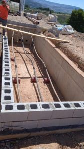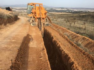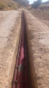 Ejecución de más de 6.900m de canalización formada por 3 tubos PE de 200mm y 2 tubos de PE de 63mm embebidos en prisma de hormigón. A lo largo de la canalización se ejecutan 5 cámaras de 9,00x 2,30m para alojar los empalmes de los cables de alta tensión, tapado con arena y losa de hormigón una vez realizados.