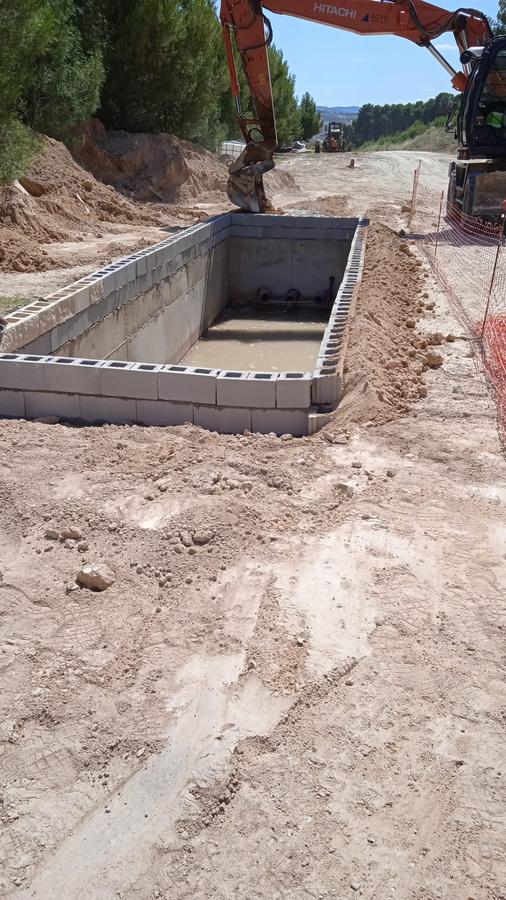 Ejecución de más de 6.900m de canalización formada por 3 tubos PE de 200mm y 2 tubos de PE de 63mm embebidos en prisma de hormigón. A lo largo de la canalización se ejecutan 5 cámaras de 9,00x 2,30m para alojar los empalmes de los cables de alta tensión, tapado con arena y losa de hormigón una vez realizados.